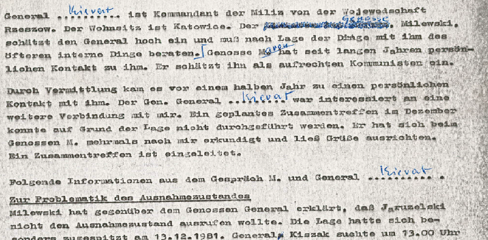 A completely different account of the same day was presented by General Mirosław Milewski, one of the most important representatives of so called “healthy forces” and top Party official with clandestine ties to Soviet secret services. In his story, Jaruzelski’s decision-making process lasted longer and the order was issued only under the pressure of top brass from the Ministry of Defense and Ministry of the Interior. Milewski’s version of events can be found in the Stasi report describing the meeting between Rudolf Maroń and general Józef Kierat – head of civilian security apparatus in Rzeszów from 1979 to 1990. It seems that Milewski valued him very much, trusted him, thus the two frequently discussed the political situation. Maroń also regarded Kierat as a true communist and was to already meet him in December 1981 but plans were thwarted by the Martial Law. Maroń finally managed to talk with Kierat during the spring of 1982, and the Stasi operatives in an uncanny way obtained the report from that meeting. It must be remembered that abovementioned memo is a third-party information and its content could be slightly distorted by subsequent recipients. Nor can it be treated literally, because Kierat, presenting Milewski’s account, indicates 13 December 1981, as the day of making the decision on Martial Law, while it is known that the action was then in progress. It seems that Milewski describes the events of 12  December 1981, which is also indicated by the fact that his story to some point overlaps with Jaruzelski’s and Kiszczak’s statements.